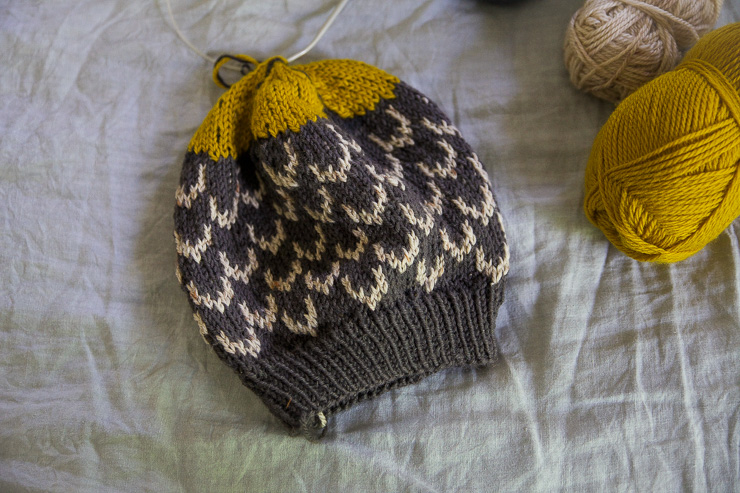I've almost finished my Flower King beanie from Anna Maltz's gorgeous book Penguin. The pattern calls for a big pom-pom on top, but I'm thinking an i-cord finish might be better for my little penguins to wear to school.